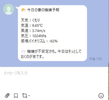 毎朝、天気・気圧・気温・風速・バイオリズム(感情)をもとに、妻の機嫌を予測し、LINEに通知するBotを作りたいです。