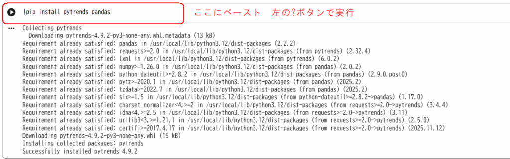 必要なライブラリをインストールします。Colabのセルに以下を貼り付けて実行してください。